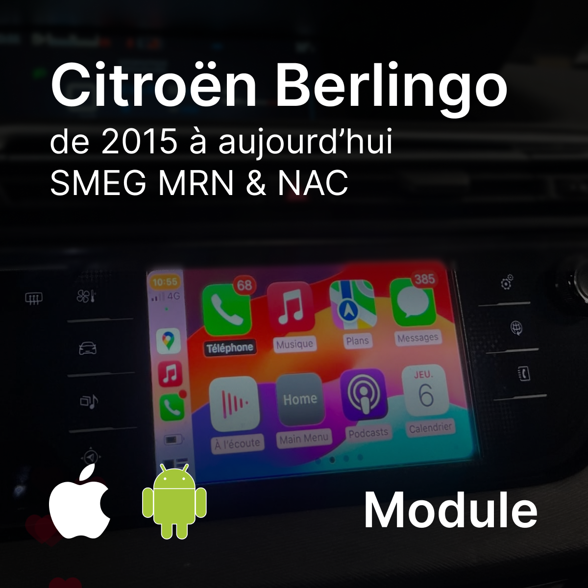 Give a new dimension to your Citroen Berlingo (2015 to today) thanks to our module CarPlay And Android Auto , specially designed for systems SMEG MRN And NAC . This module allows you to take full advantage of your smartphone's features directly from your vehicle's screen, for smoother and more connected driving.