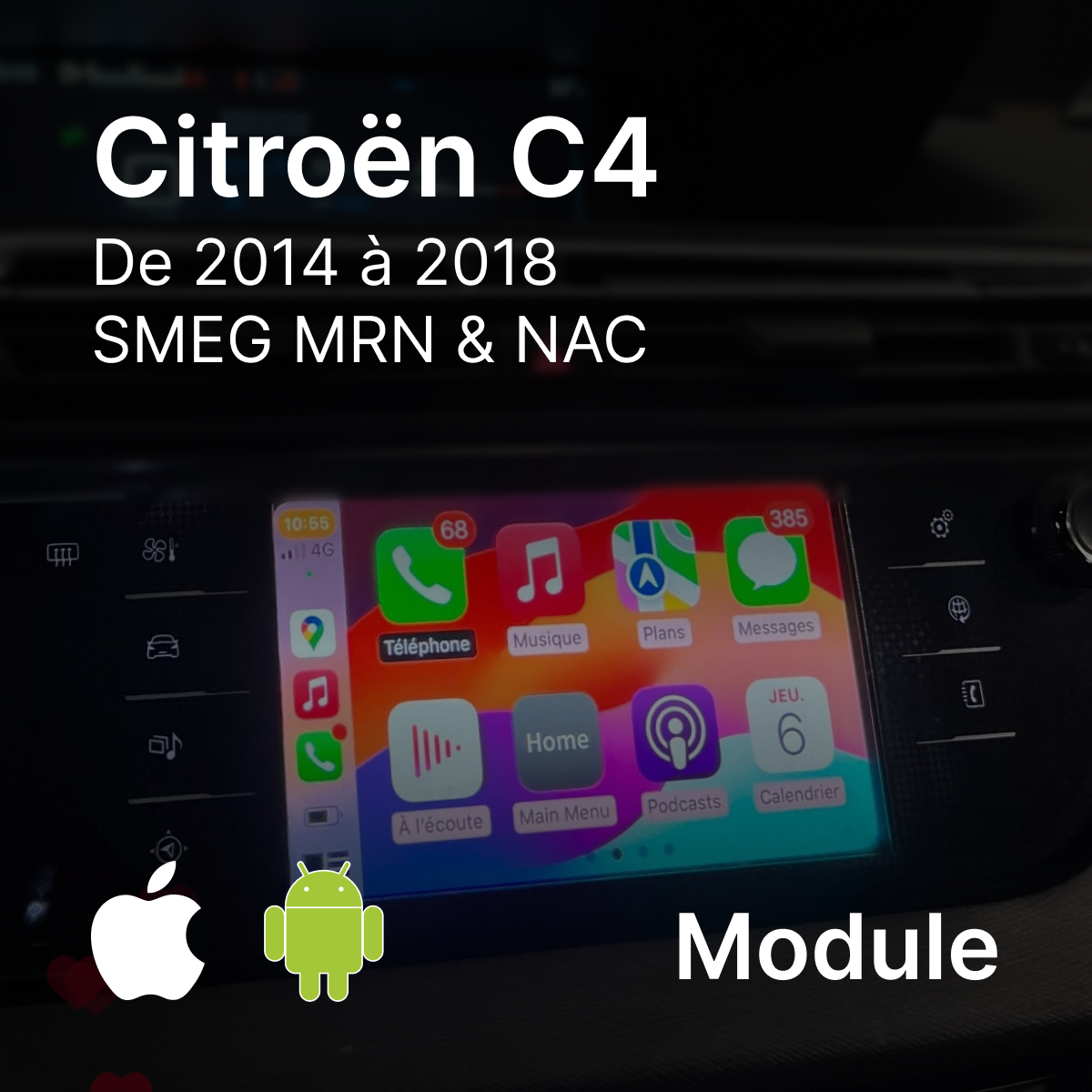 Give a new dimension to your Citroen C4 (2014-2018) thanks to our module CarPlay And Android Auto , specially designed for systems SMEG MRN And NAC . This module allows you to take full advantage of your smartphone's features directly from your vehicle's screen, for smoother and more connected driving.